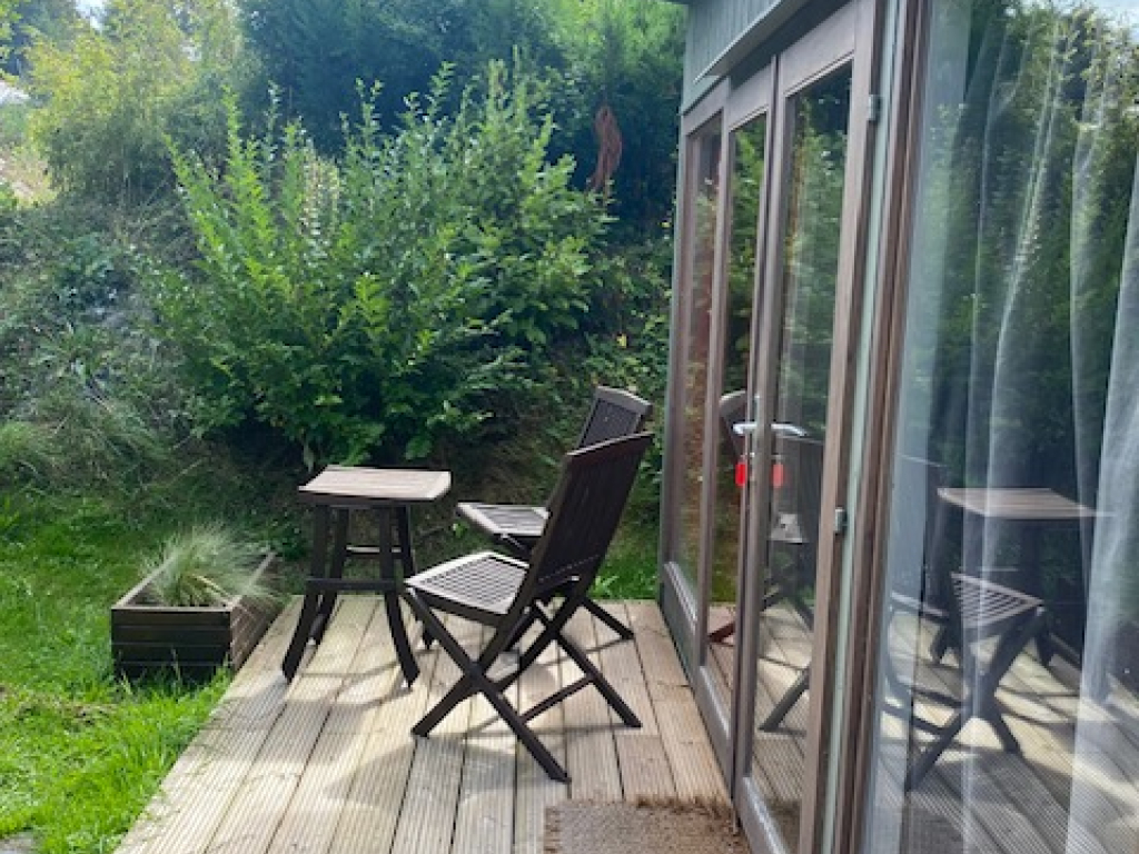 Petit jardin avec terrasse en bois et salon de jardin , ainsi qu'un préau plein sud dans la maison de l'hôte si la météo n'est pas favorable pour déjeuner.