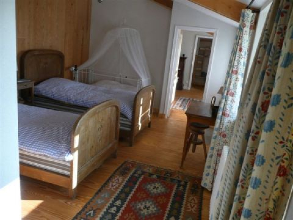 Chambre avec sa salle de bain, 2 lits (1, 90 m x 1 m chacun) + 1 lit d' enfant à barreaux, avec sortie indépendante.