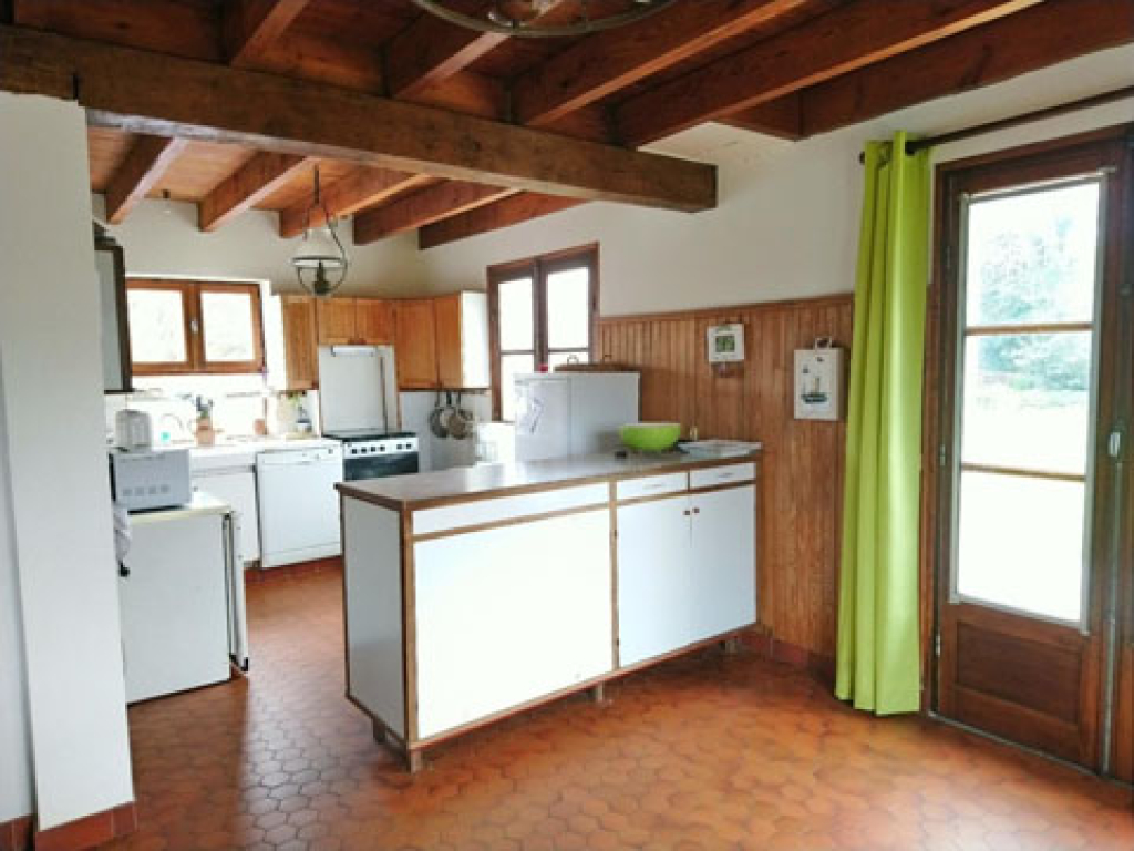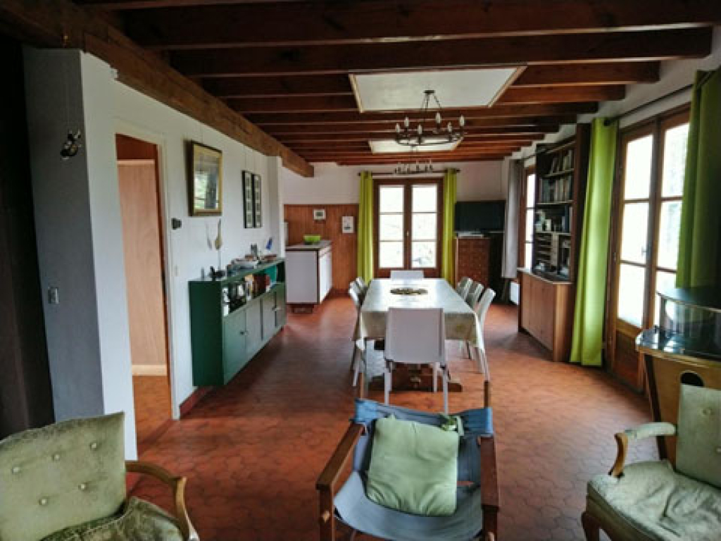 Rez de Chaussée : grande pièce à vivre, cuisine ouverte sur le séjour et salle de bain douche et toilettes.