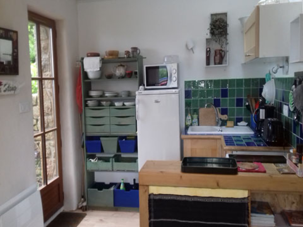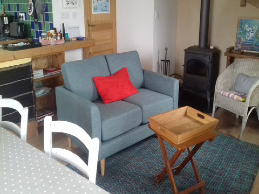 Séjour avec poêle à bois et radiateur électrique, canapé, fauteuil, bibliothèque, TV, table 4 personnes, coin cuisine équipée avec cuisinière électrique, réfrigérateur , four à micro-ondes, vaisselle et matériel de cuisson pour 4 personnes .