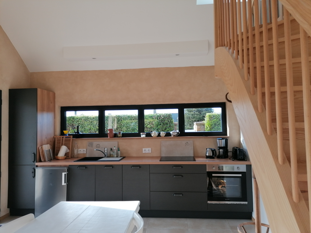 Matériaux écologiques. De plein pied et accessible PMR. Il dispose d'une pièce de vie avec cuisine équipée et coin salon; Une chambre avec lit de 160. Une salle de bain avec douche à l'italienne et équipée de toilettes sèches. Une mezzanine avec banquette BZ munie d'un bon couchage en 140... Une terrasse et un jardin plein sud avec barbecue,salon de jardin,et chaises longues.