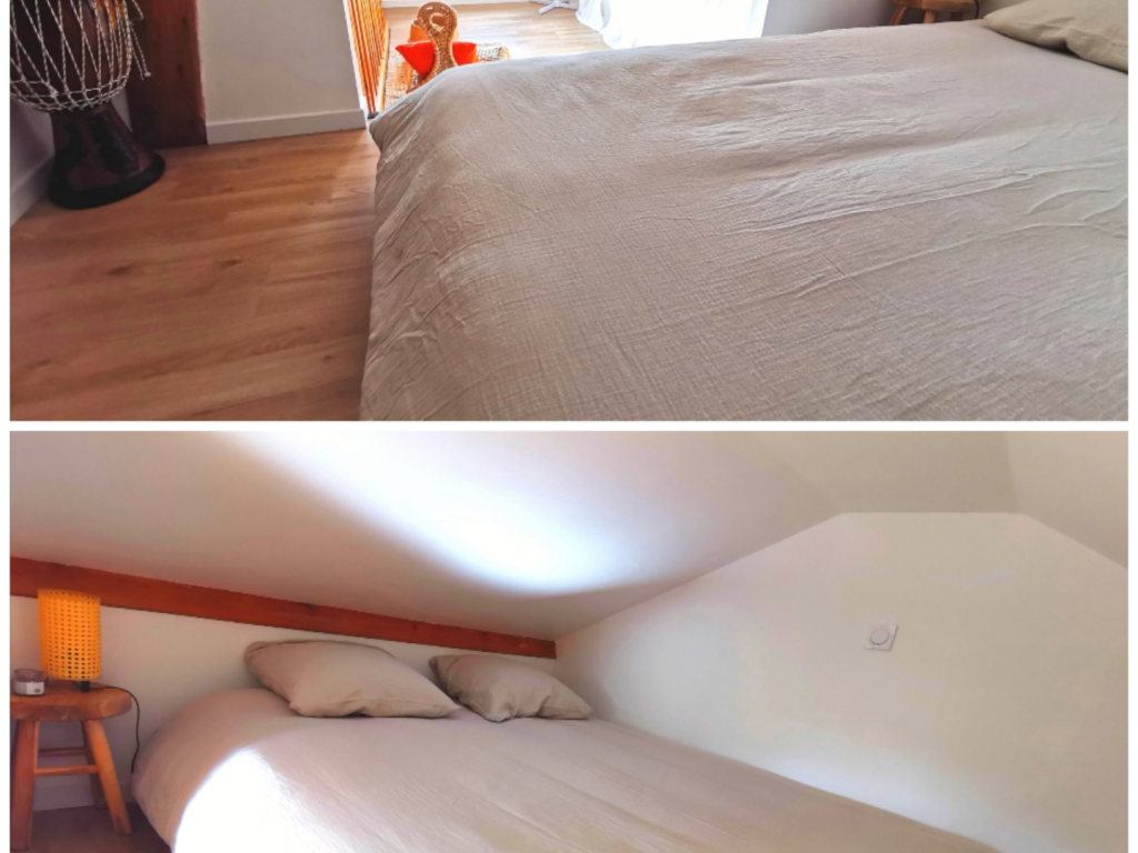 Une belle chambre au rez-de-chaussée et un grand espace chambre ouvert sur mezzanine à l'étage vous accueillent pour vous reposer.