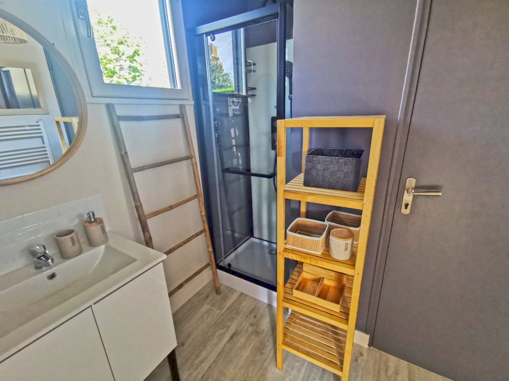 - 🚿 La salle de bain est équipée d'une cabine de douche de 70 X 70 cm.